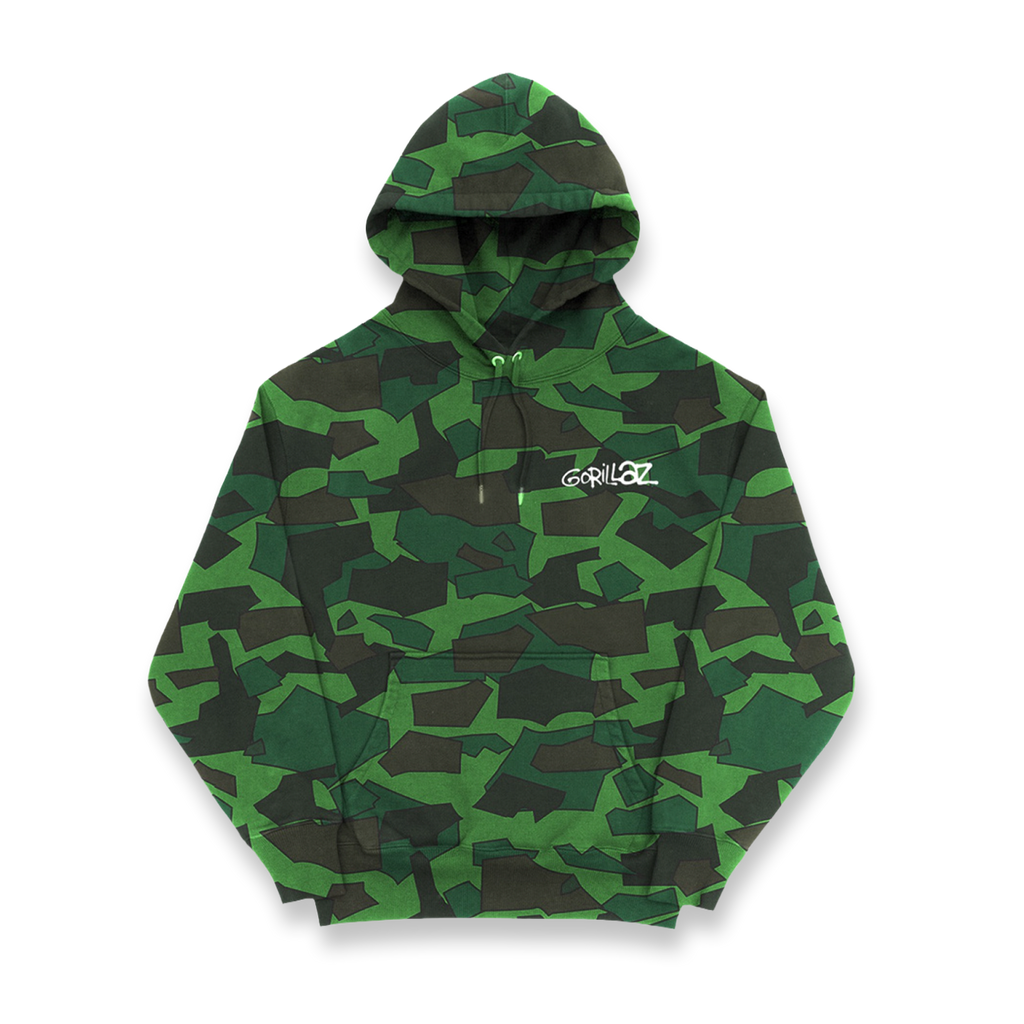 All over iconic Gorillaz camo print hoodie with front Gorillaz logo embroidery. As seen at Gorillaz House of Kong.