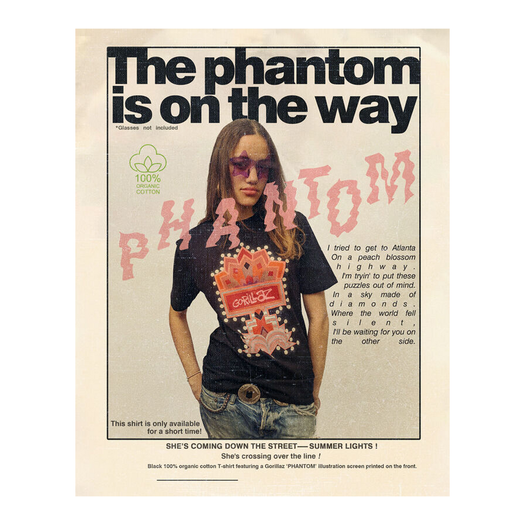 Black 100% organic cotton t-shirt featuring a ‘Phantom’ illustration screen printed on the front.