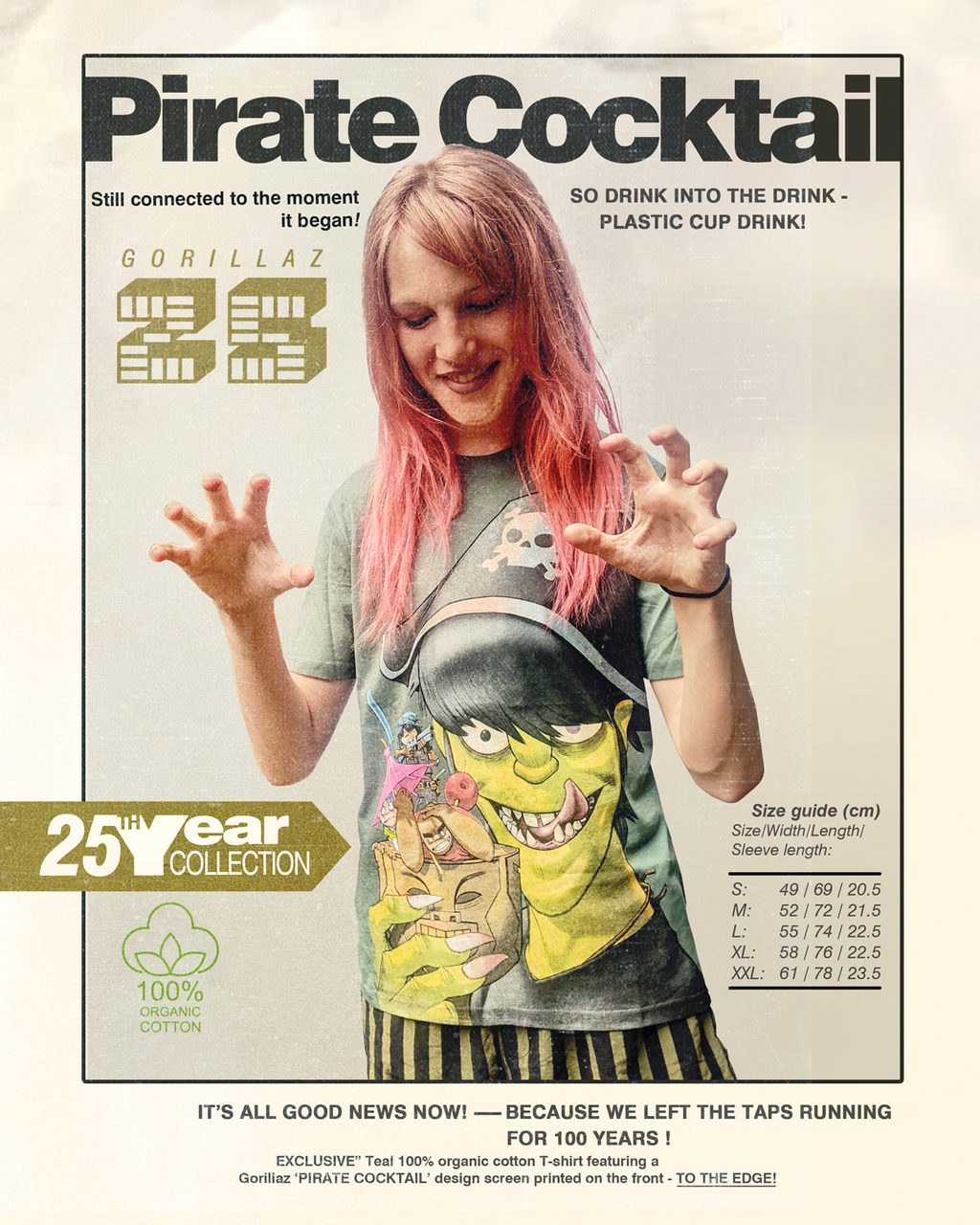 Teal 100% organic cotton t-shirt featuring a Gorillaz 'Pirate Cocktail' design screen printed on the front all the way to the edge.